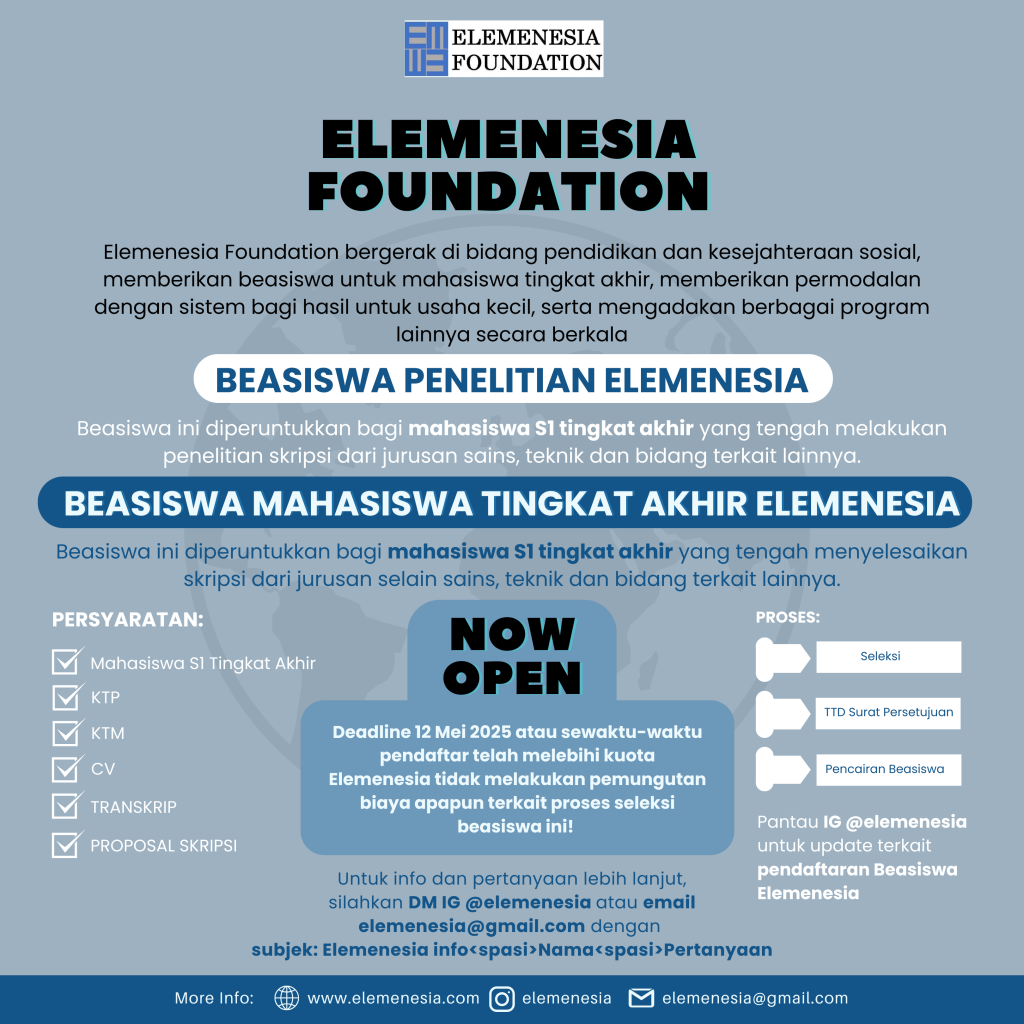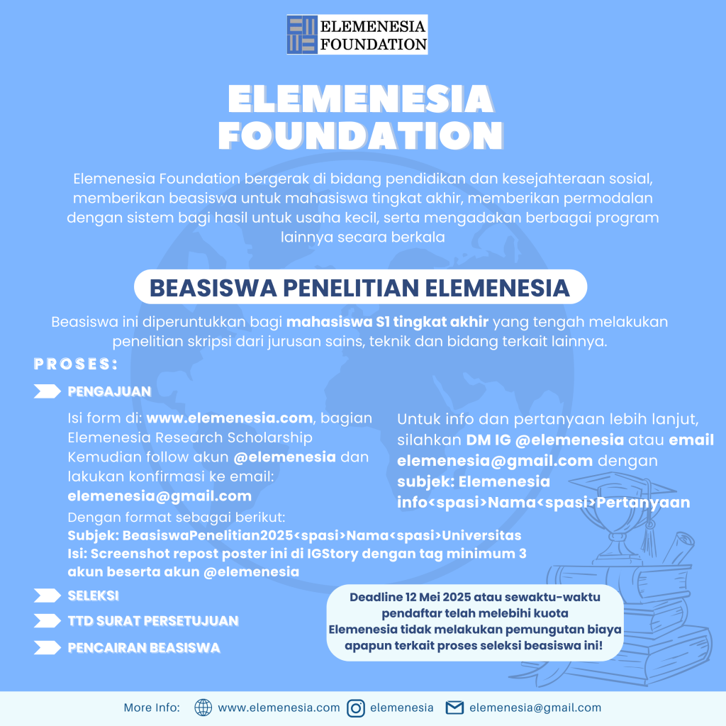 Elemenesia, program yang bergerak di bidang pendidikan dan kesejahteraan sosial, kembali membuka pendaftaran beasiswa penelitian bagi mahasiswa tingkat akhir jurusan sains, teknik dan bidang terkait lainnya untuk menyelesaikan skripsi/tugas akhir S1.